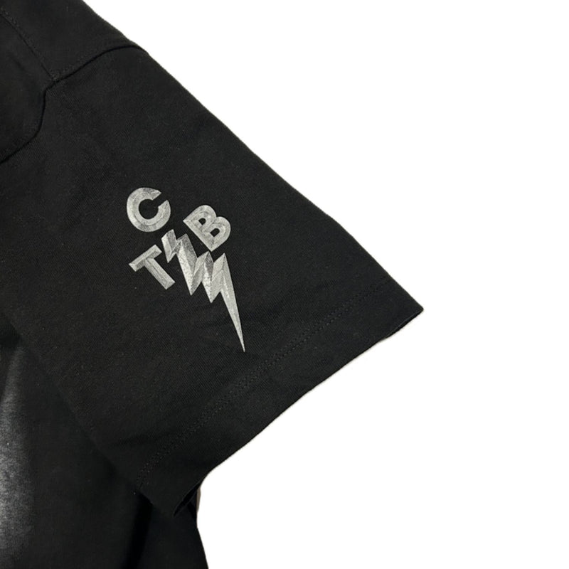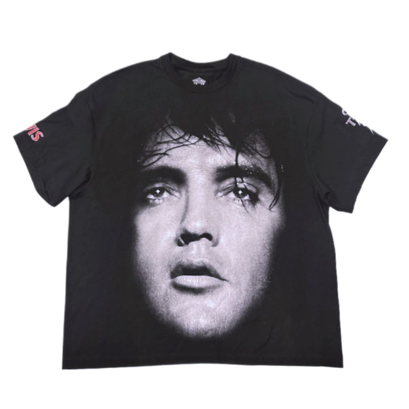 Celebrate the King of Rock and Roll with this striking oversized tee. Featuring an up close alluring black and white portrait of Elvis Presley, this shirt captures the legend's iconic magnetism. Detailed sleeve graphics—a black and white TCB logo on the left and a bold red ELVIS emblem on the right—add authentic flair. Perfect for devoted fans and vintage music enthusiasts, this comfortable black cotton essential brings timeless style to any wardrobe.