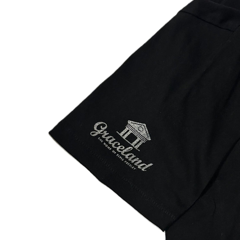 Celebrate the King of Rock and Roll with the Elvis Presley In Concert Collage Crop T-Shirt. This shirt features a dynamic front black and white collage design of Elvis Presley concert images from the 1970's and Elvis Presley In Concert text printed in a metallic silver ink. The sleeves are donned with the iconic TCB logo on the left sleeve and the official Graceland logo on the right sleeve for an authentic touch for true fans. Perfect for anyone who wants to wear their Elvis devotion with style and attitude.