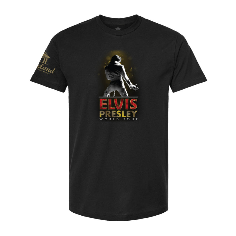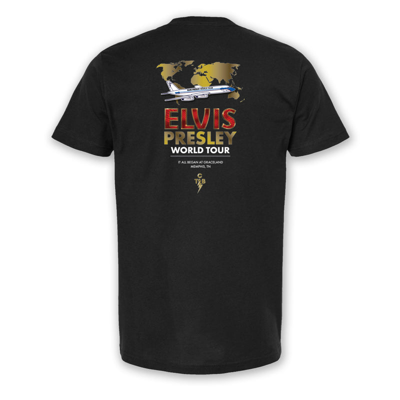 Celebrate Elvis' dream of a world tour with this exclusive Elvis Presley World Tour T-Shirt. The front showcases a striking performance image of Elvis with world tour branding, while the back features globe-inspired artwork, the iconic Lisa Marie airplane, and the meaningful message "It All Began at Graceland, Memphis, TN." The left sleeve features the official Graceland logo. This t-shirt honors Elvis' legendary global impact. Perfect for fans who want to commemorate the world tour Elvis always dreamed of.