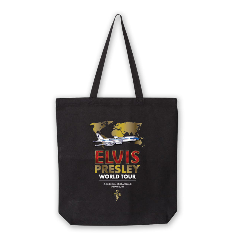 Carry a piece of Elvis history with this exclusive World Tour Tote Bag. One side showcases a striking performance image of Elvis with world tour branding, while the reverse features globe-inspired artwork, the iconic Lisa Marie airplane, and the meaningful message "It All Began at Graceland, Memphis, TN." This tote bag celebrates Elvis' legendary global impact. Perfect for fans who want to commemorate the world tour Elvis always dreamed of.