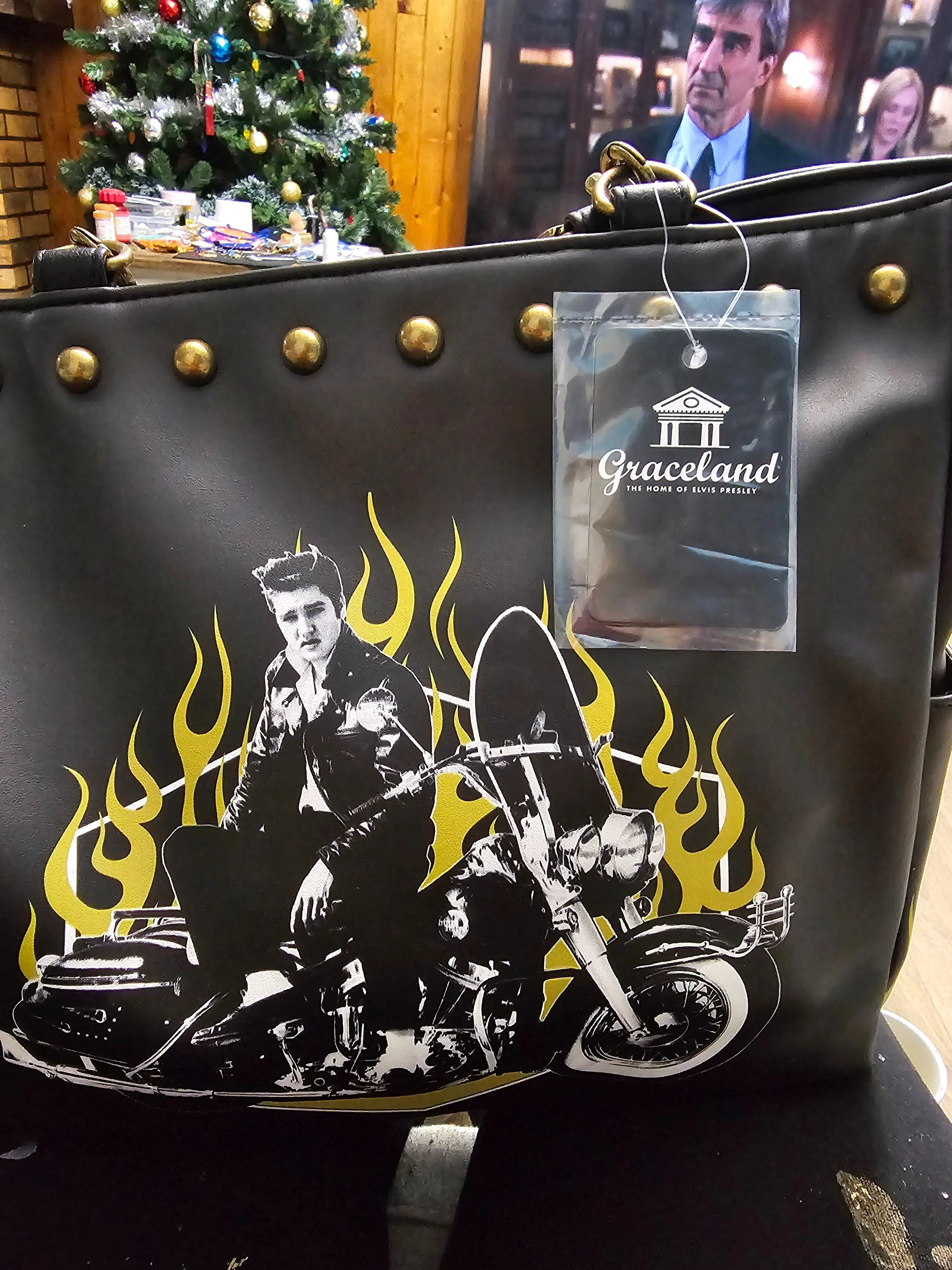 If you LOVE Elvis rebel chic the Elvis Motorcycle Flames Tote Bag is the bag for you! Both sides of this fabulous satchel style tote are emblazoned with a photo of Elvis and one of his beloved motorcycles surrounded by gold tone flames and accented by large gold tone metal studs across the top. The flame graphics are repeated on each end making this one hot carry-all bag! Add this bold new Elvis tote to your collection today--ORDER NOW!