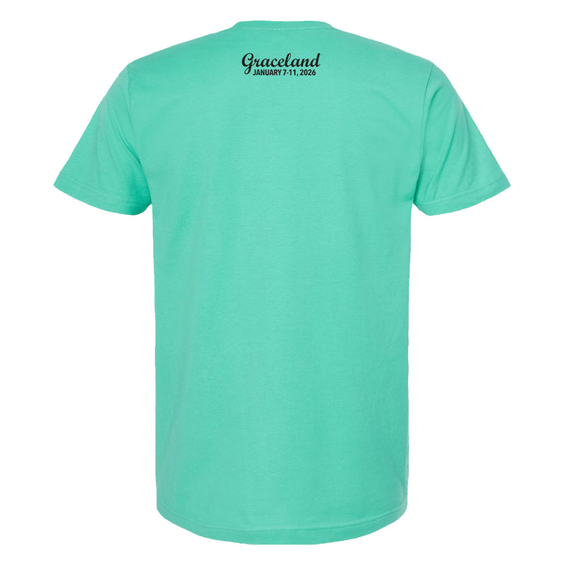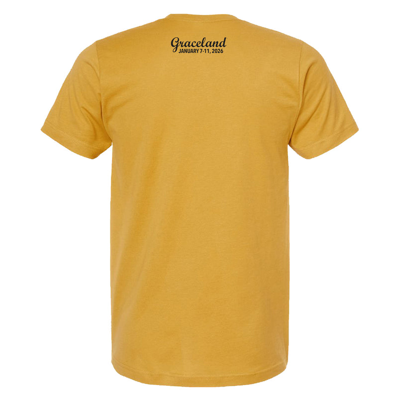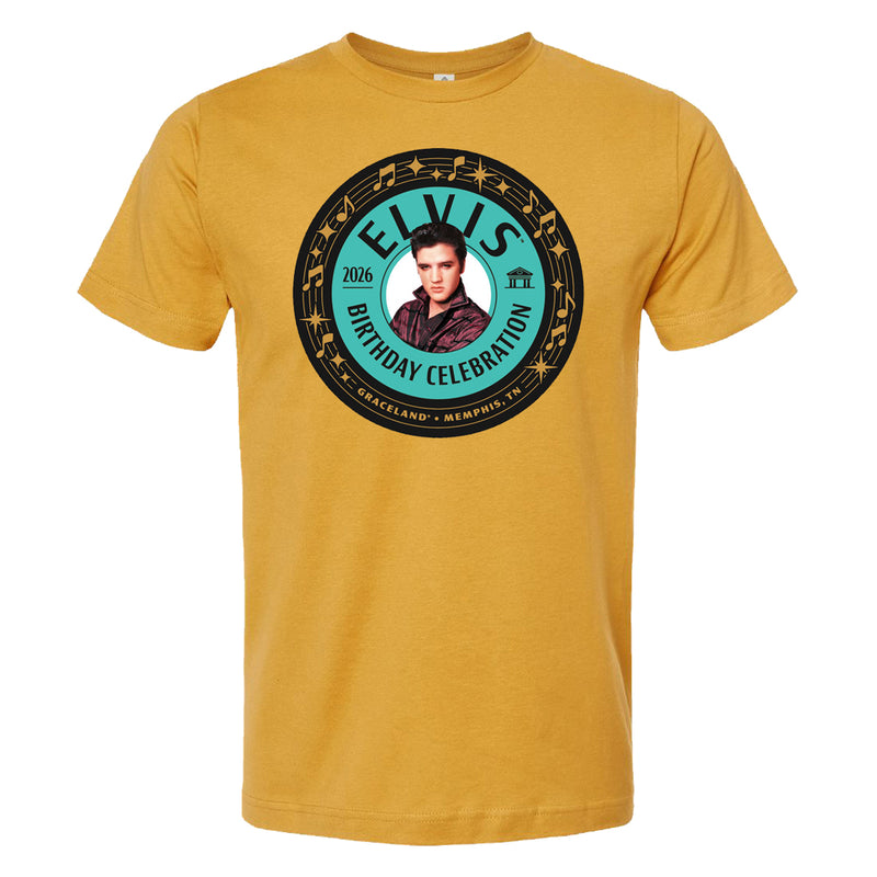 Celebrate the King's legacy with this striking 2026 Elvis Birthday T-shirt featuring a vinyl record design with a photo of Elvis Presley in the records center. Bold "ELVIS" lettering tops the design, followed by "2026 Birthday Celebration" and the Graceland logo. Gold-tone musical notes frame the record's edges, with "Graceland Memphis TN" completing this must-have tribute. "Graceland" and "January 7-11, 2026" is proudly printed on the back of the T-shirt collar. Perfect for fans who want to wear their devotion proudly.