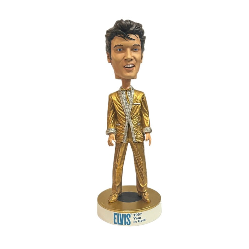 Commemorate the King with this striking 1957 Year In Gold head knocker. Featuring Elvis in his iconic gold lamé suit—the outfit that defined an era—this collectible captures the moment that changed music forever. The gleaming gold finish and dynamic design make it a standout piece for any Elvis fan or memorabilia collector. Perfect for display on a desk, shelf, or dashboard, this head knocker brings vintage rock and roll energy to any space. A must-have tribute to the year Elvis became a cultural phenomenon.