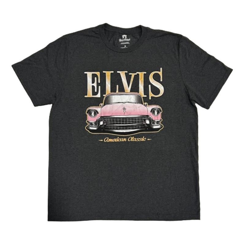 Celebrate the King of Rock and Roll in this striking t-shirt featuring a front-view illustration of an iconic pink classic car. The design showcases intricate details including a TCB emblem on the hood, "Elvis" printed in bold yellow gold and white letters, and "American Classic" printed in script beneath the car. Perfect for fans who appreciate timeless style and music history, this tee combines retro with contemporary flair. A must-have for any Elvis enthusiast's wardrobe.