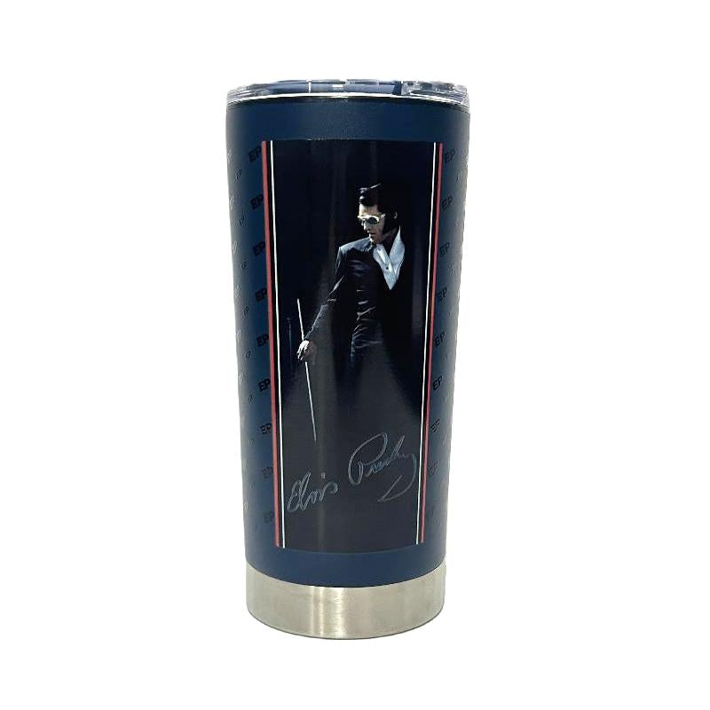 Carry your beverages in style with this Elvis Presley Airlines Travel Tumbler. Featuring the iconic Elvis air logo and a glossy EP initial background pattern, this tumbler showcases the King himself on the back alongside his legendary signature. Perfect for coffee, tea, or any drink on the go, this collectible piece combines functionality with timeless Elvis memorabilia. Keep your drinks at the perfect temperature while celebrating the legacy of rock and roll's greatest icon.