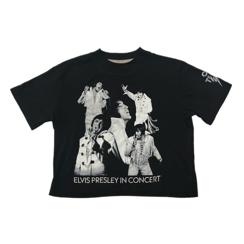 Celebrate the King of Rock and Roll with the Elvis Presley In Concert Collage Crop T-Shirt. This shirt features a dynamic front black and white collage design of Elvis Presley concert images from the 1970's and Elvis Presley In Concert text printed in a metallic silver ink. The sleeves are donned with the iconic TCB logo on the left sleeve and the official Graceland logo on the right sleeve for an authentic touch for true fans. Perfect for anyone who wants to wear their Elvis devotion with style and attitude.