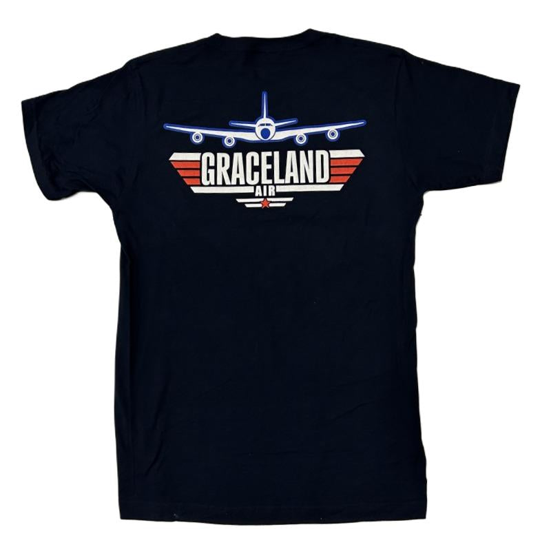 Display your devotion to music royalty and aviation with the Graceland Air stripe logo t-shirt. The Elvis Presley stripe logo sits prominently on the front left, while the back reveals the Graceland Air stripes logo. Crafted for fans who want to honor the king in comfort and style, this shirt transforms everyday wear into a statement of passion and nostalgia.