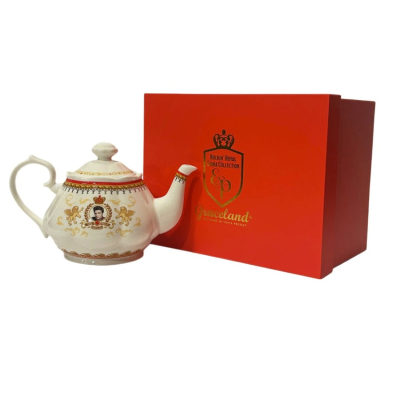 Celebrate the King in timeless elegance with the Rockin' Royal China Teapot. This stunning piece features a royal-inspired crest showcasing majestic lions, a regal crown, and golden yellow laurel leaves framing Elvis Presley's portrait at its center. A decorative trim in rich red, golden yellow with gold accent adorns the top, bottom and spout of the teapot. Printed red jewel accents adorn the lid. "The King Of Rock And Roll" is proudly printed down the handle—a perfect tribute for devoted fans and collectors who appreciate both iconic design and functional artistry.