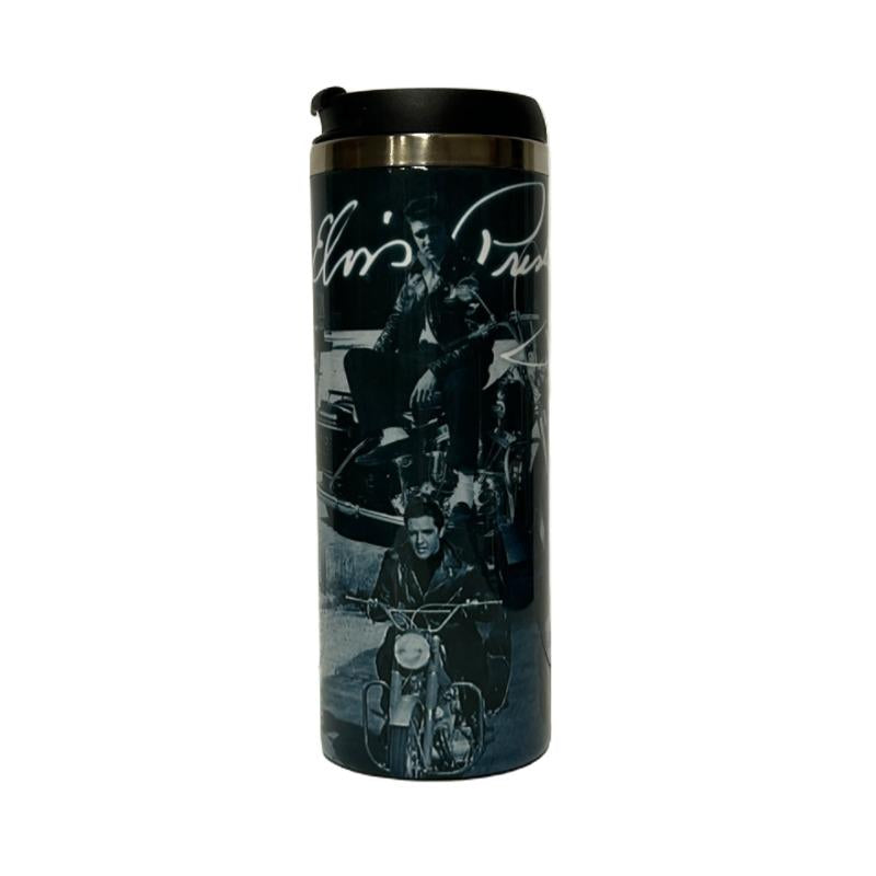 This striking tumbler showcases Elvis Presley astride his iconic motorcycle, complete with his legendary signature in crisp white. Perfect for coffee, beverages, or displaying your devotion to the King of Rock and Roll. This durable tumbler keeps drinks at the ideal temperature while making a bold statement wherever you go. An essential piece for Elvis fans and motorcycle enthusiasts alike.