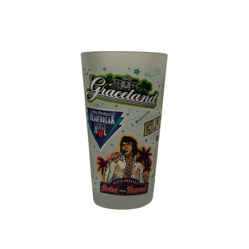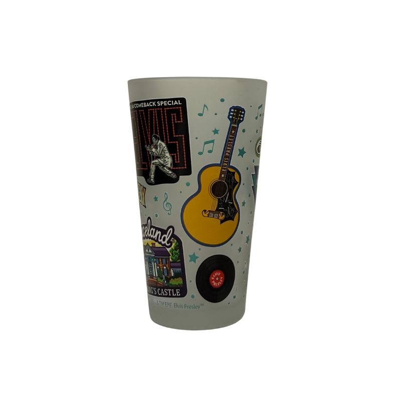 Raise a glass to rock 'n' roll royalty. This pint glass brings together a stunning sticker-style collage showcasing Elvis's most groundbreaking performances, the iconic Graceland mansion, and legendary symbols spanning his extraordinary career. The frosted design delivers a sophisticated look while the vibrant illustrated artwork captures the energy and charisma that made Elvis a cultural phenomenon. Whether you're a devoted collector or casual fan, this glass lets you celebrate the King's timeless influence with every sip.