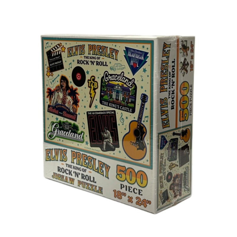 Piece together the legend with this vibrant Elvis Presley King of Rock 'N Roll puzzle. Featuring a dynamic sticker-style collage of iconic performances, the legendary Graceland mansion, and career-defining logos, this puzzle celebrates the King's revolutionary impact on music history. Perfect for fans and collectors, each piece brings you closer to completing a stunning visual tribute to Elvis's unforgettable legacy. Display your finished masterpiece as a bold statement of rock 'n roll devotion.