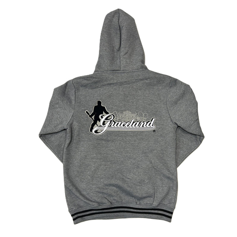 The Graceland Timeline Pullover Hoodie combines classic style with iconic details. Crafted in heather charcoal, it features "Graceland" embroidered in black across the front and "The Home Of Elvis Presley" embroidered along one sleeve for a tribute to a legendary legacy. Three unique patches decorate the other sleeve, adding distinctive flair. The back of the hoodie features an embroidered design of the original Graceland logo. Finished with black stripe detailing on the elastic bottom and sleeve cuffs, this hoodie offers both comfort and a bold statement for any fan looking to celebrate Elvis Presley’s timeless influence.