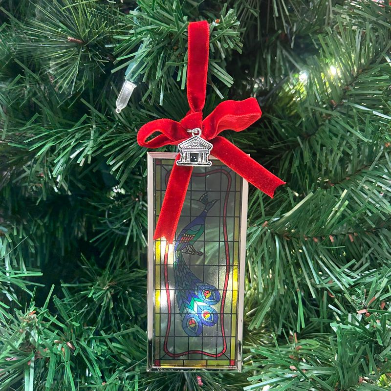 Bring a touch of Graceland elegance into your home with this stunning glass ornament, inspired by the iconic peacock stained glass windows from Elvis's legendary living room. Crafted with meticulous detail, the ornament captures the vibrant artistry and timeless glamour of the King's most recognizable décor. A luxurious red velvet bow adorned with a silver-tone Graceland logo charm completes this collectible piece, making it the perfect addition to any fan's holiday display or year-round décor. Celebrate Elvis's legacy with every glance.